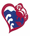 氷見あいやまガーデンのシンボルマークは、愛と喜びを表すハートで全体を包み、美と愛の象徴である花の女王「薔薇」、そして自然の躍動感・活力を表す「立山」と「富山湾」をモチーフに、力強く表現したものです。このガーデンを訪れた方々に、喜び、癒し、活力を与えたいと、東京在住の紙版画作家・ツツミエミコさんがデザインしました。